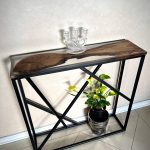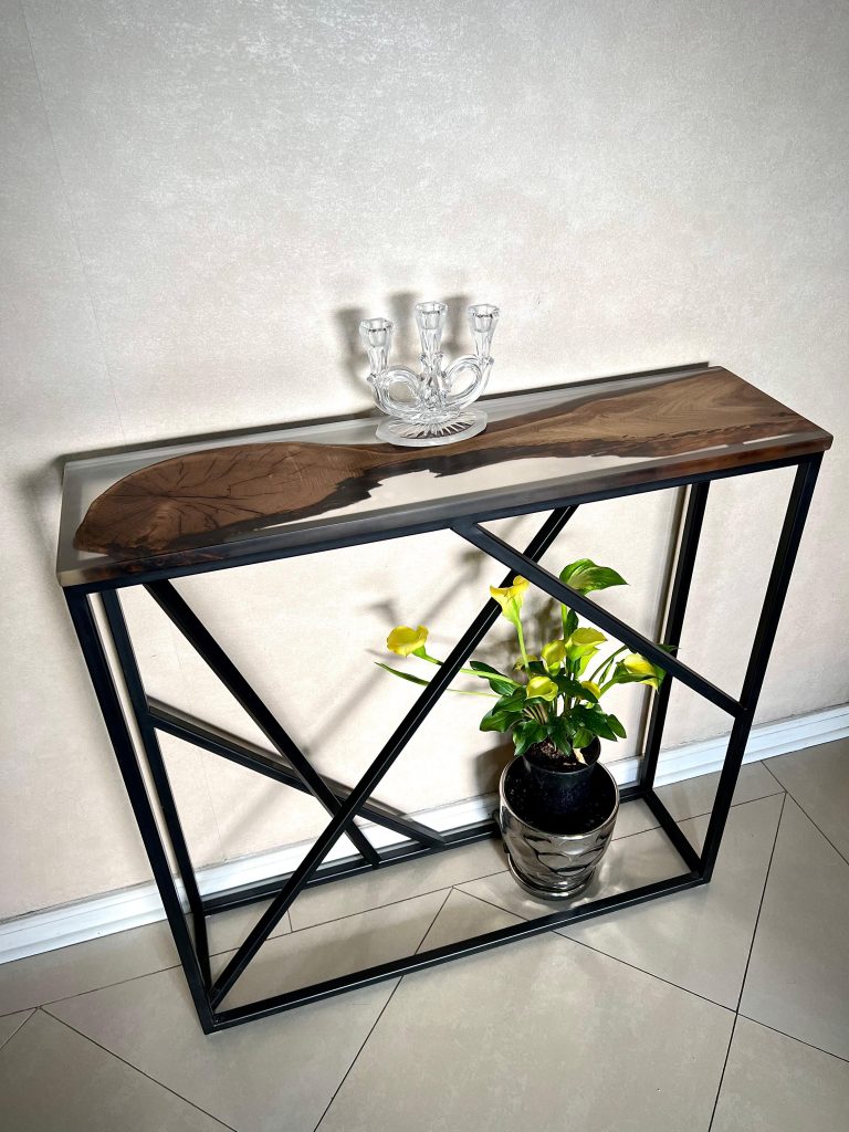 Arrimo en madera nogal y resina epoxy cristal con base de fierro