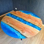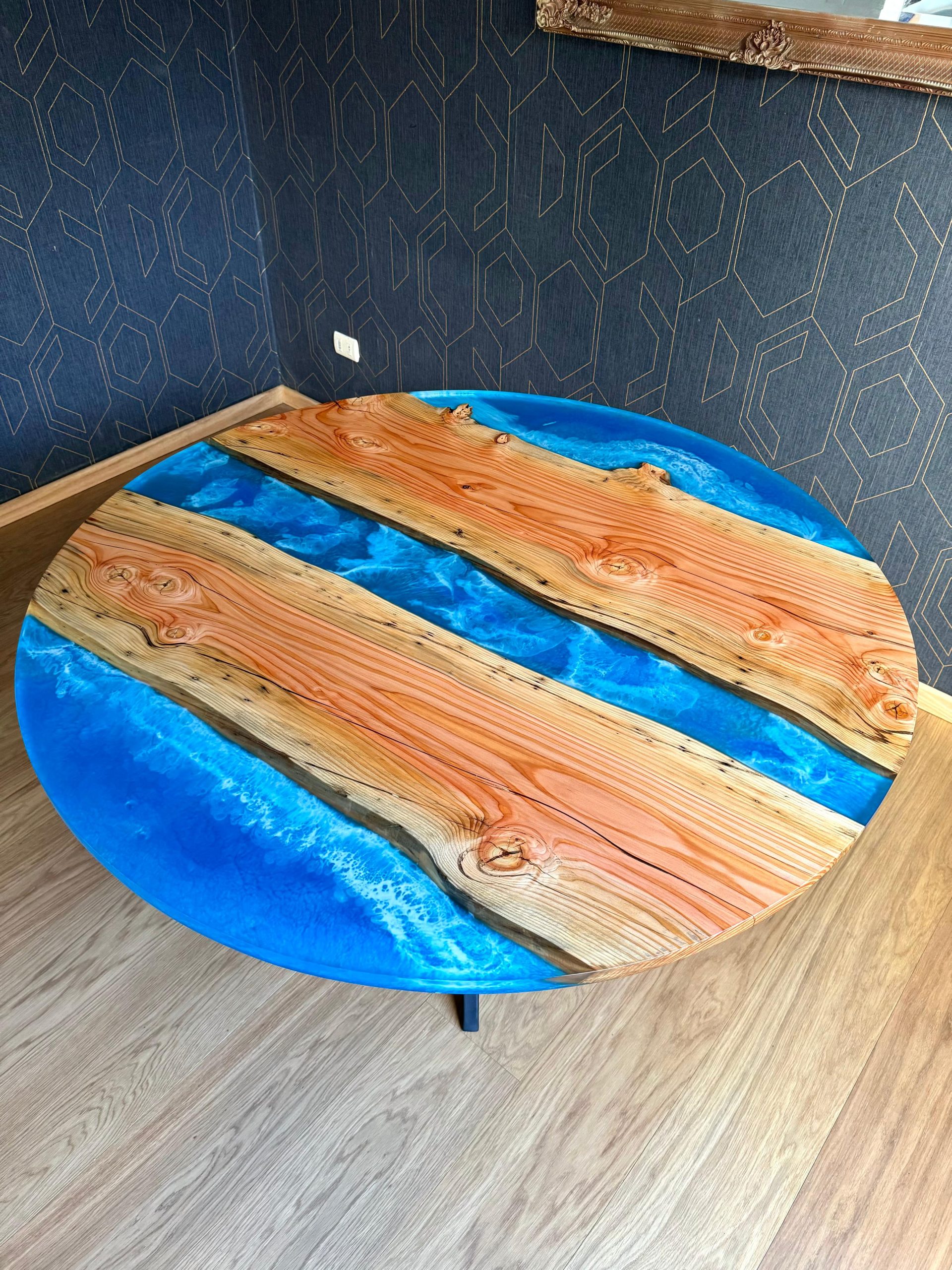 Mesa comedo redonda hecha en cipres y resina epoxy efecto mar