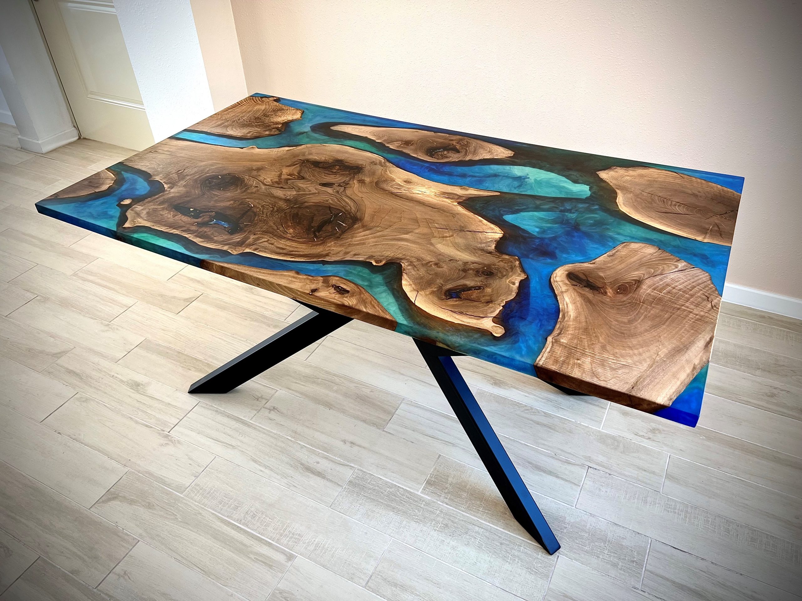 Hecha en madera nogal y resina Epoxy color galaxia, representativa de los colores de la marca Base en hierro con pintura electrostática negro mate Medidas: 160×90