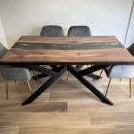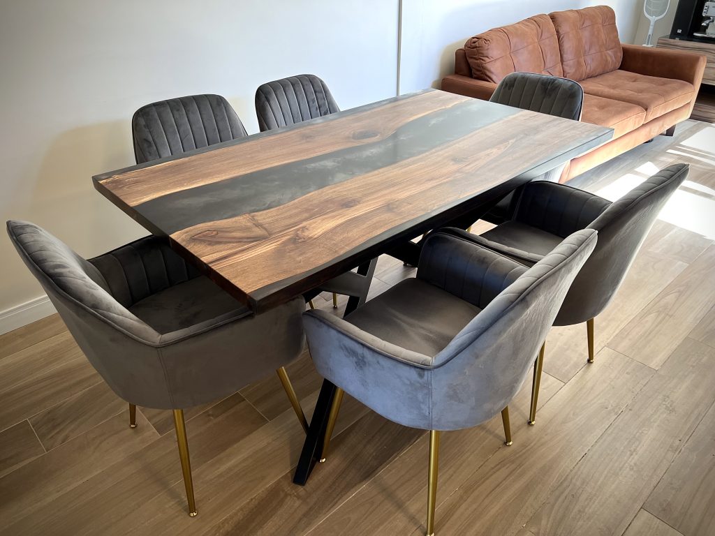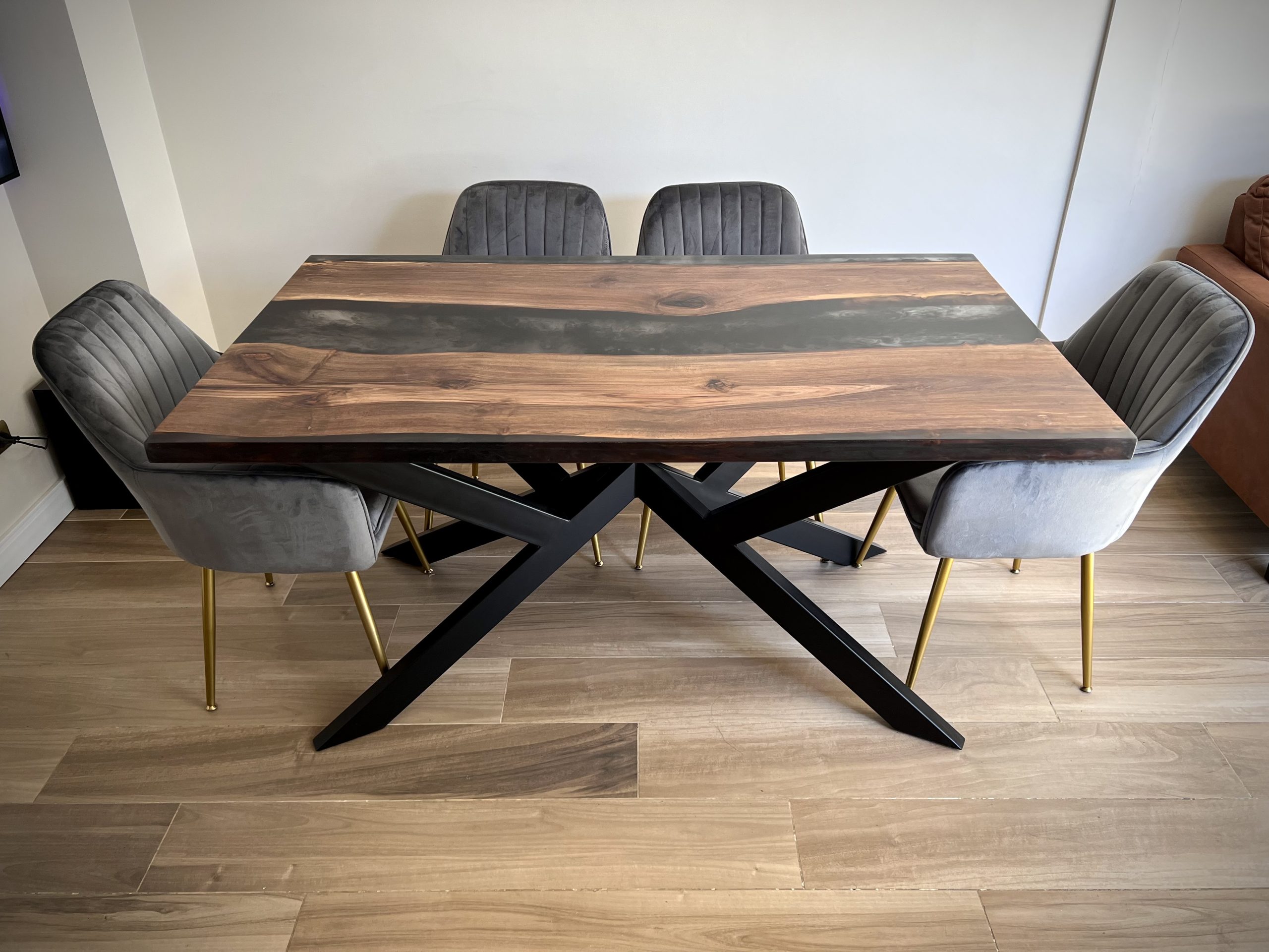 Hecha en madera nogal con resina Epoxy negro humo Base en Fierro con pintura electrostática negro mate Medidas: para 6 personas de 160×90 cm