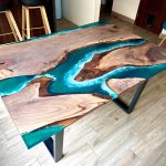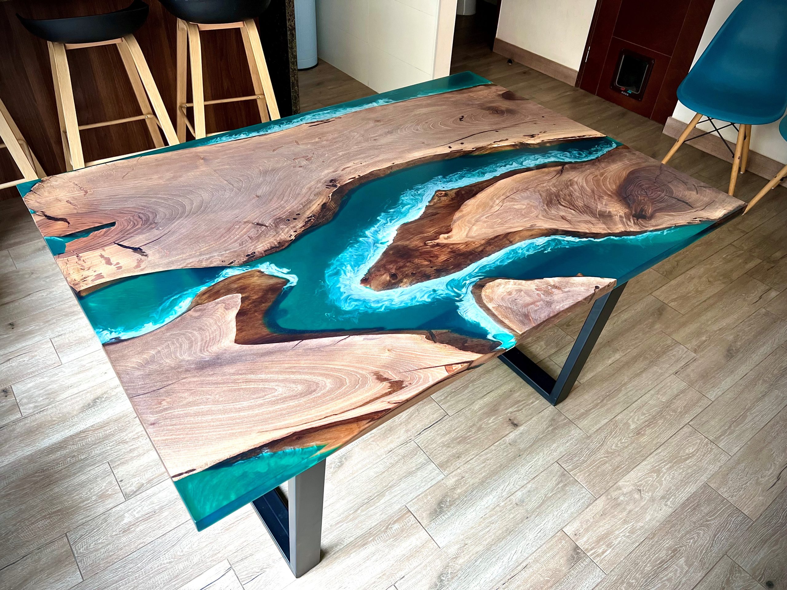 Hecha en madera nogal y resina Epoxy verde agua, con olas efecto mar Base en hierro con pintura electrostática negro mate Medidas: 160×90