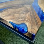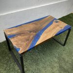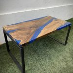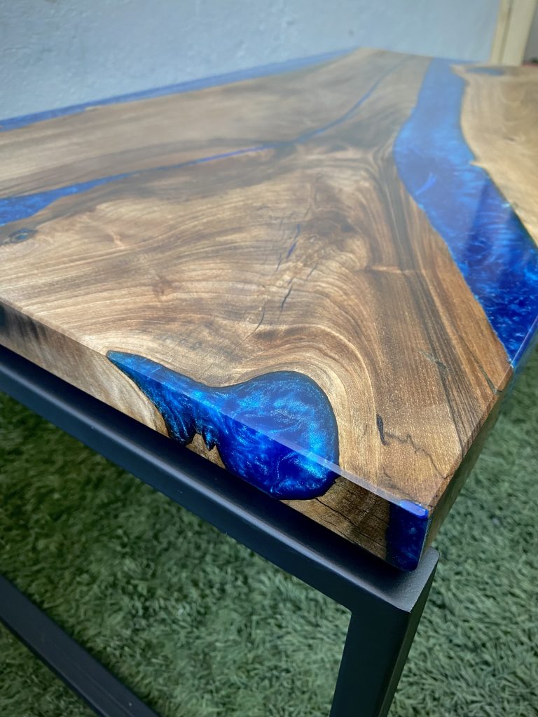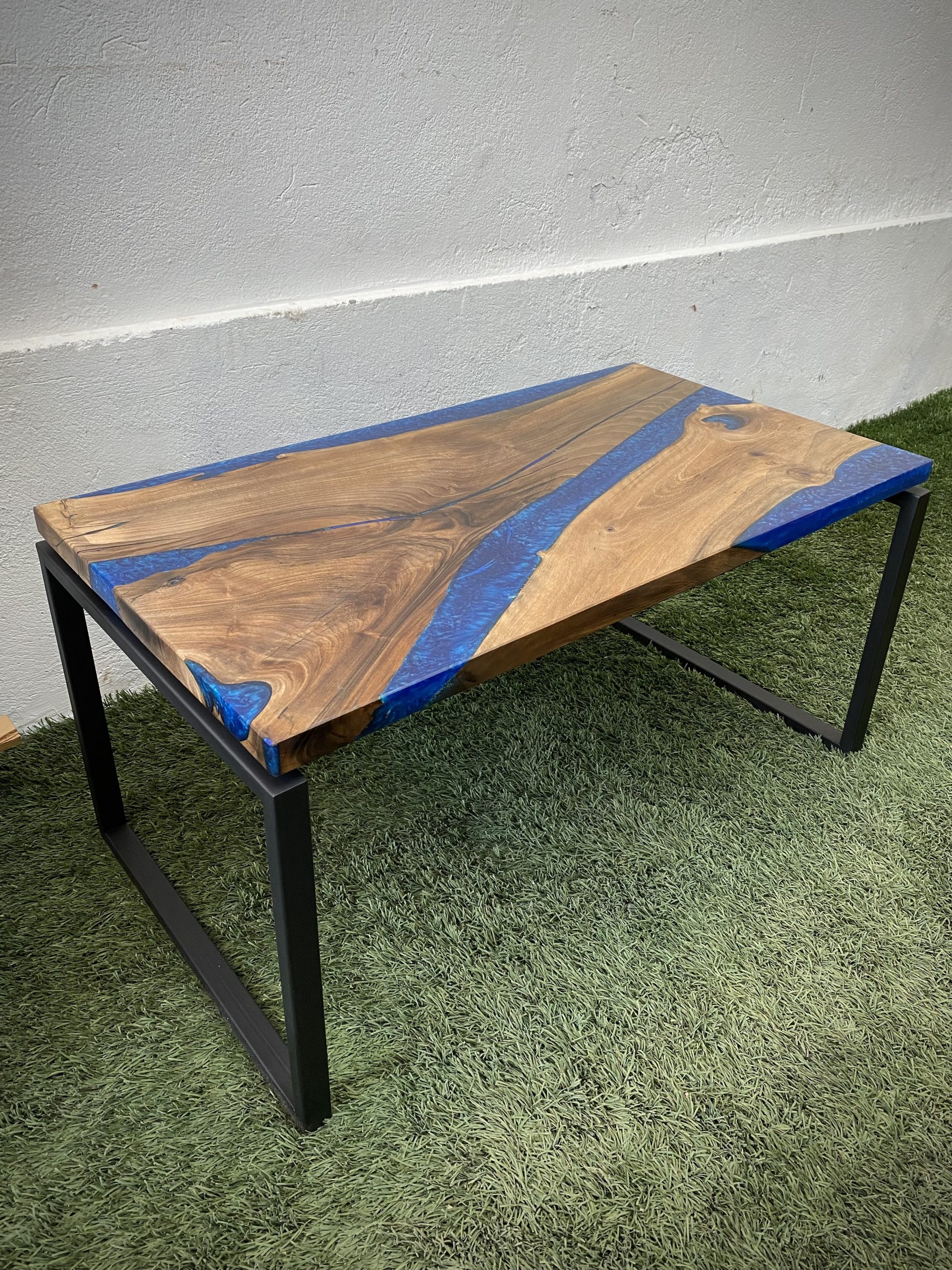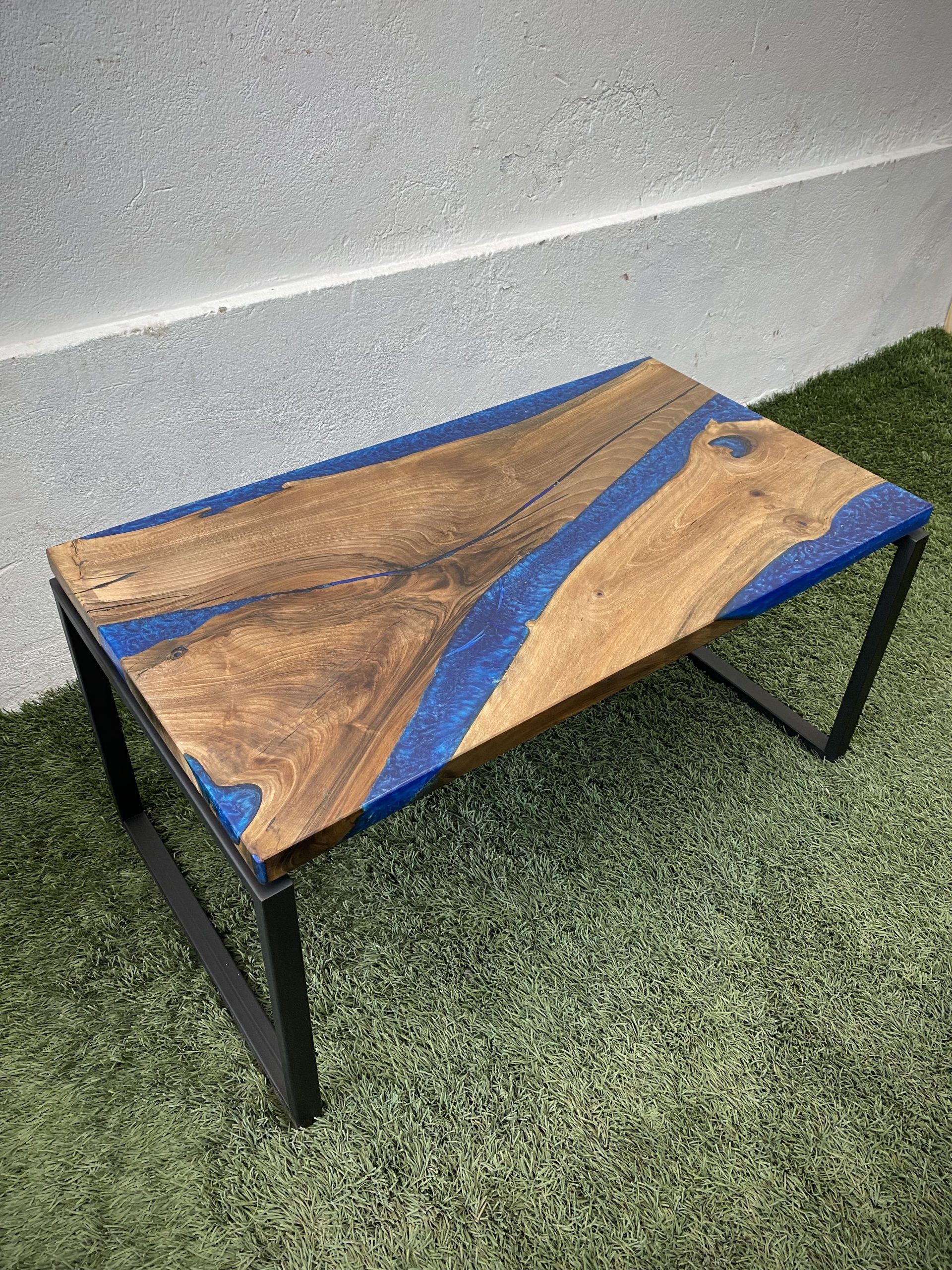 Hecha en madera de nogal, con resina Epoxy azul eléctrico Base en hierro con pintura electrostática negro mate Medidas: 100cmx60cm y 40 cm de altura