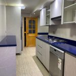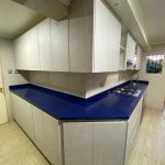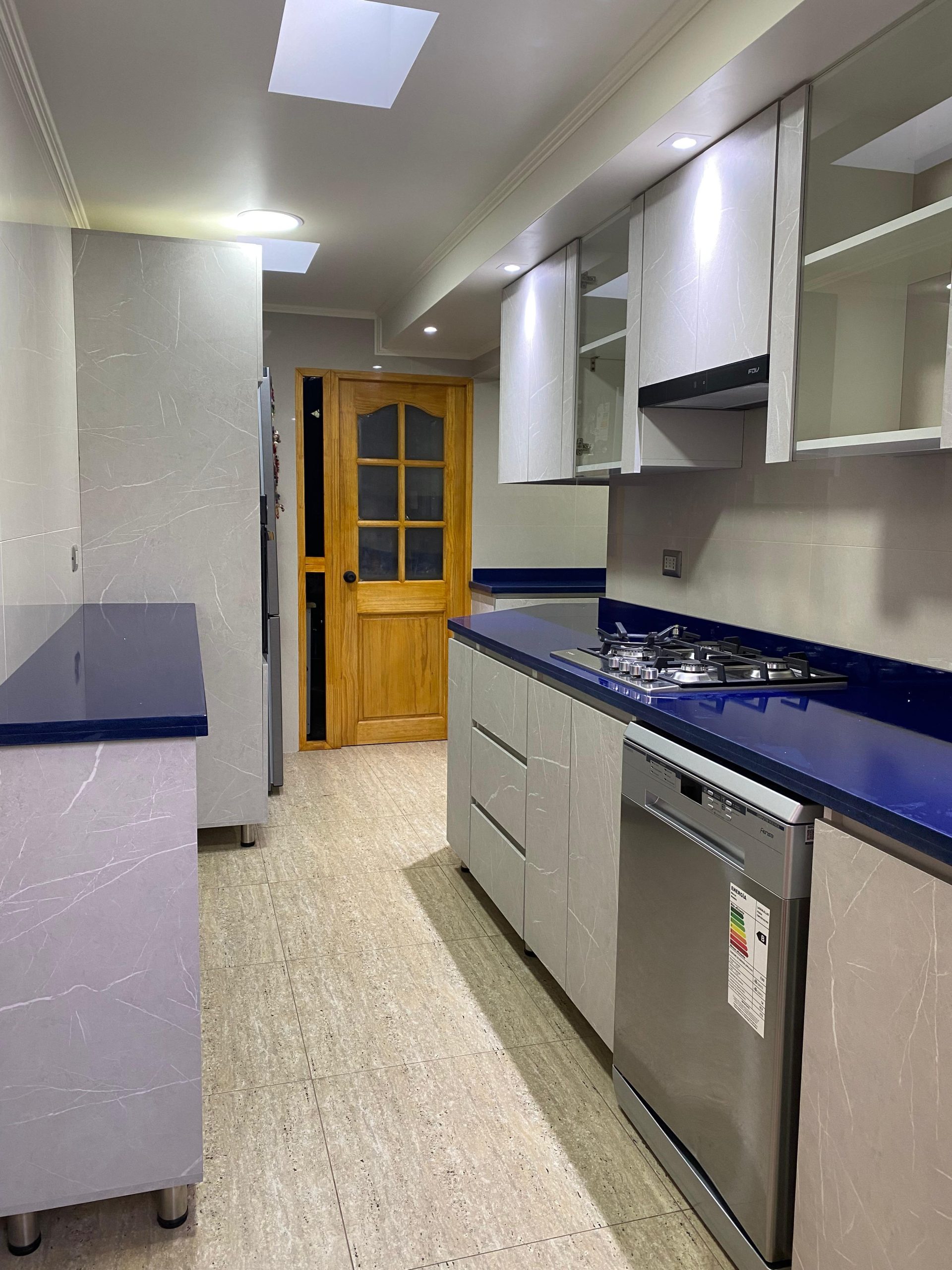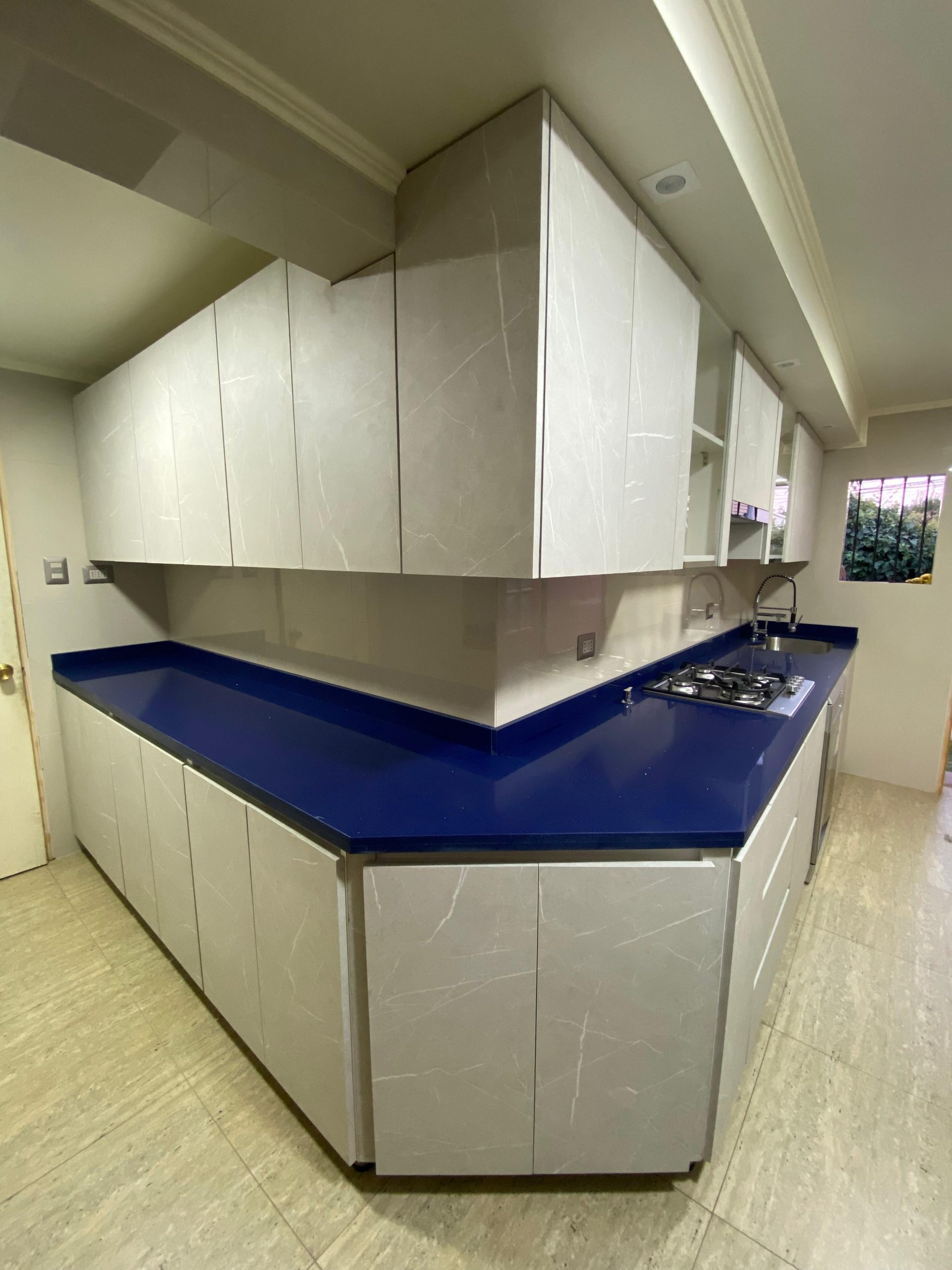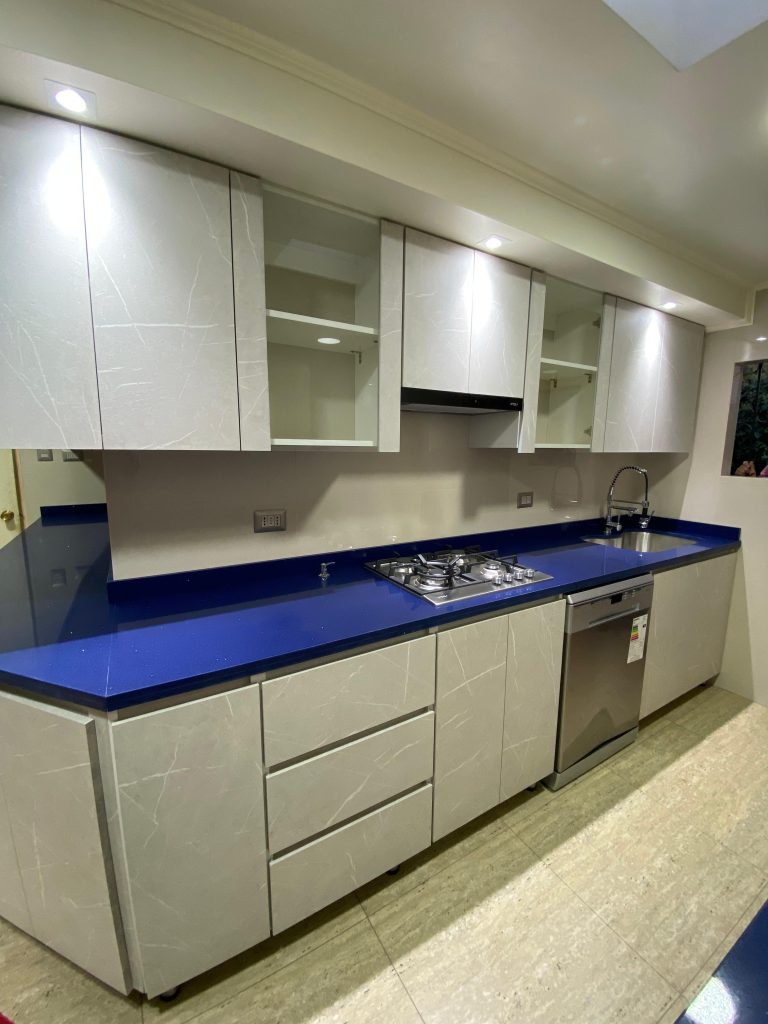 Hermosa cocina con cubierta en quarzo galaxy azul, diseñada en conjunto con cliente.Tratamos de ocupar todos los espacio posibles, pero sin cargarla demasiado, ya que el espacio era reducido.